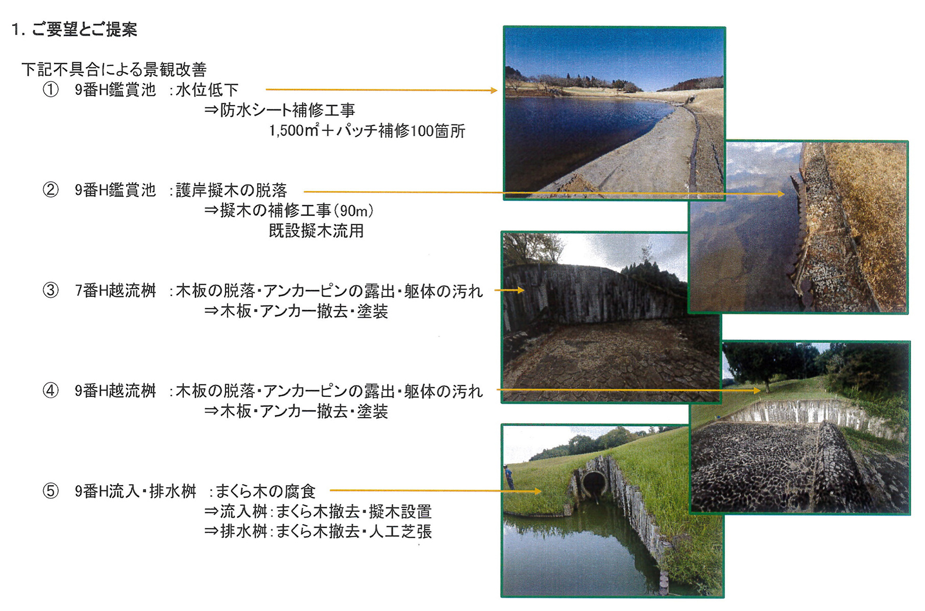 作業エリア 作業内容 工事期間 11月 12月 1月 No.9池工事 No.9 11/21~ 塗装工事 No.7,9 11/22~ 擬木設置工事 No.9 11/22~ 人工芝張り工事 No.9 12/1~ 塗装工事 No.9 12/15~ -